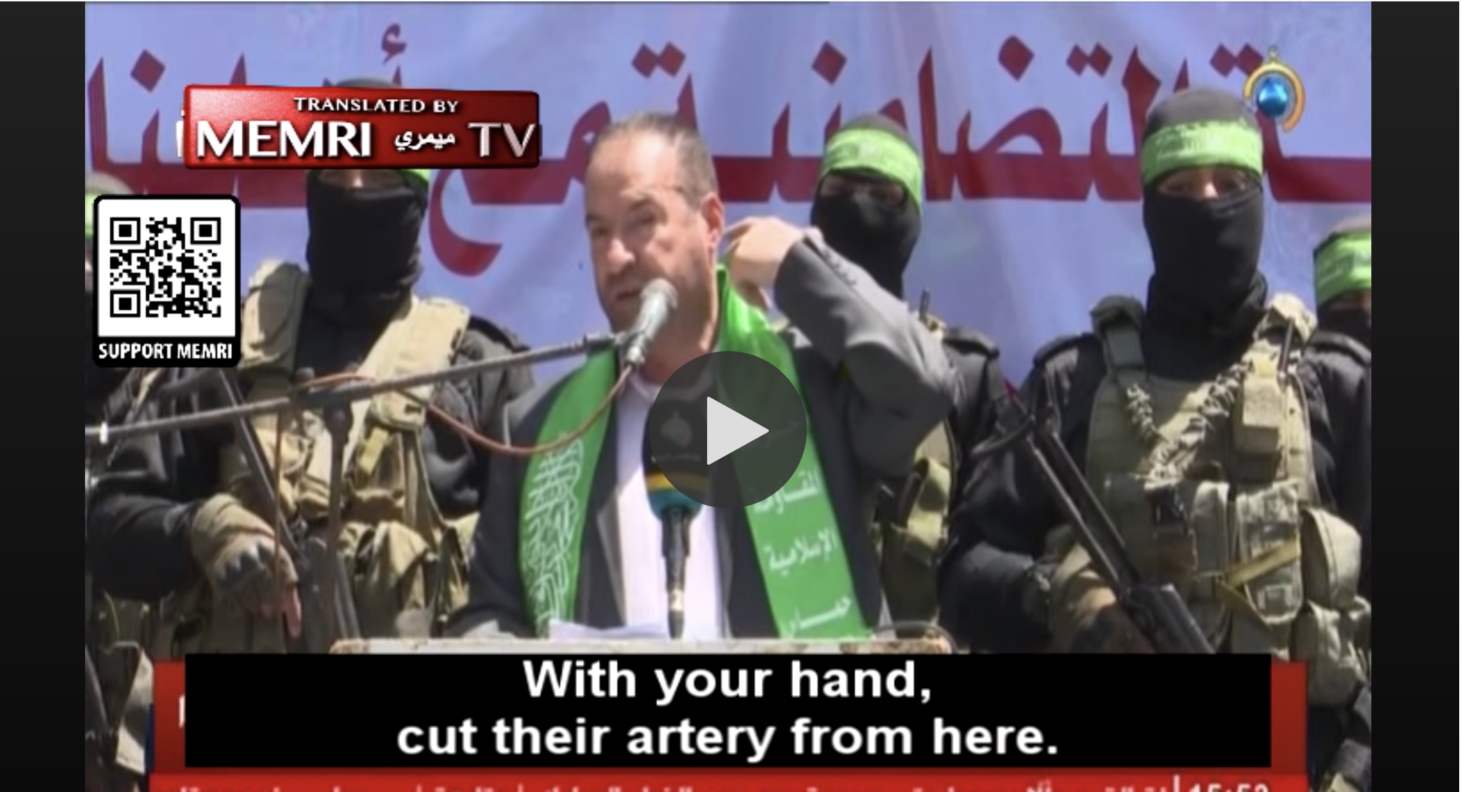 People of Jerusalem, we want you to cut off the heads of the Jews with knives. With your hand, cut their artery from here. A knife costs five shekels. Buy a knife, sharpen it, put it there, and just cut off [their heads]. It costs just five shekels. With those five shekels, you will humiliate the Jewish state. “You shall find the strongest in enmity towards the believers to be the Jews and the polytheists.” The Jews have spread corruption and acted with arrogance, and their moment of reckoning has come. The moment of destruction at your hands has arrived.